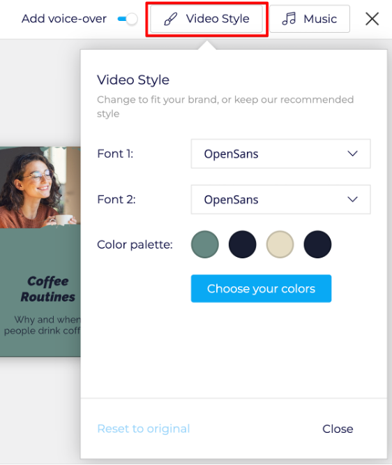 If you want to change the video style or color palette, you can do so by clicking the video style button.