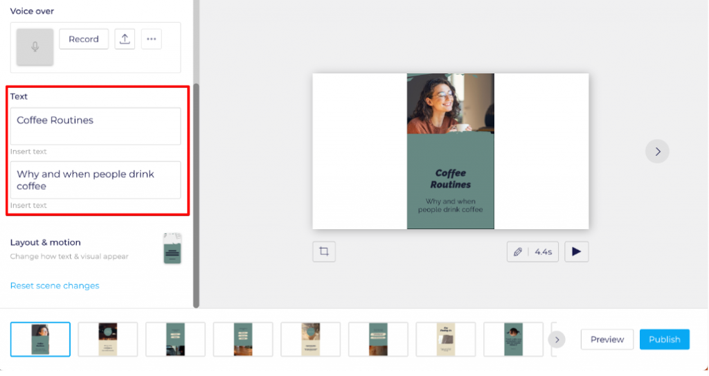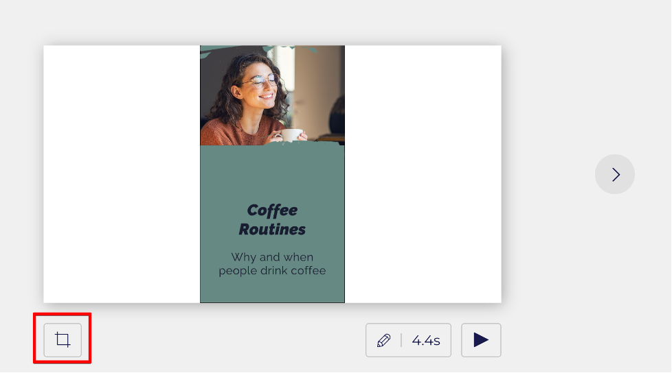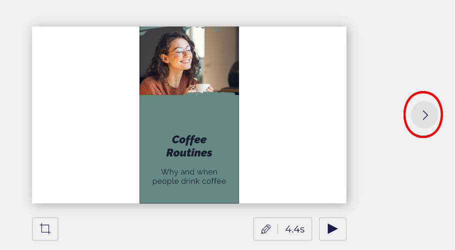 If you would like to change the number of seconds a scene in the reel goes on for, click the pencil icon (this one is set to 4.4 seconds). You can also preview this part of the reel by clicking the play button to the right of the seconds.