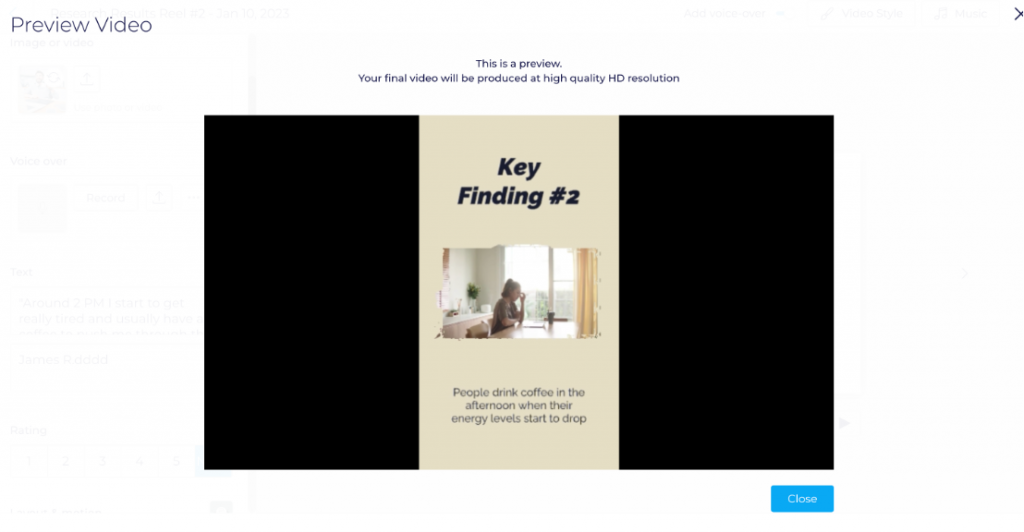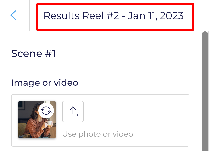 On the top of the screen, you will see the template name. The project name is the template name below, which is “Results Reel #2 – Jan 11, 2023”. If you would like to change the name, click in this area and change the name.