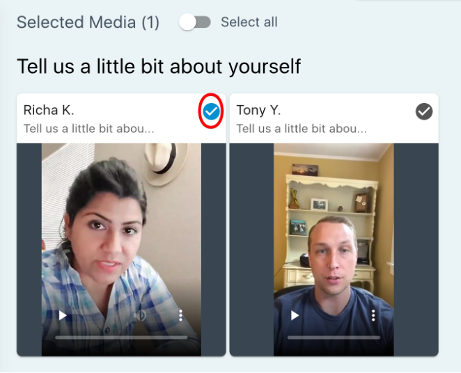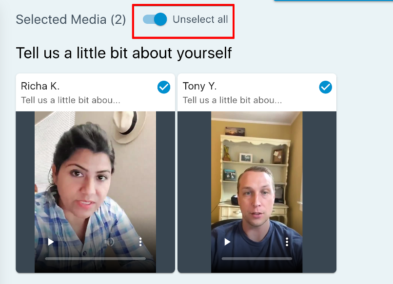 1. Click Select all at the top of the page to make all the media from the filters available in the Video Reel editor. You will not have to use all the files in your reel, but they will all be available to use.
