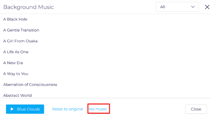In most situations, you will be building a reel that includes videos of your participants speaking, so you will most likely want to turn this option to “No Music.” however, there is a large catalog of background music you can select from, and add to your reel if needed.