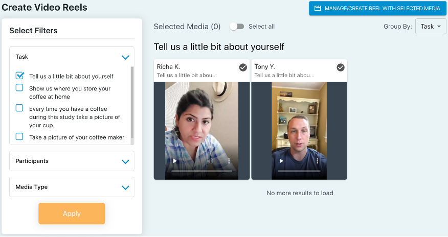 When you are ready to create the reel, click the MANAGE/CREATE REEL WITH SELECTED MEDIA button in the top right corner.